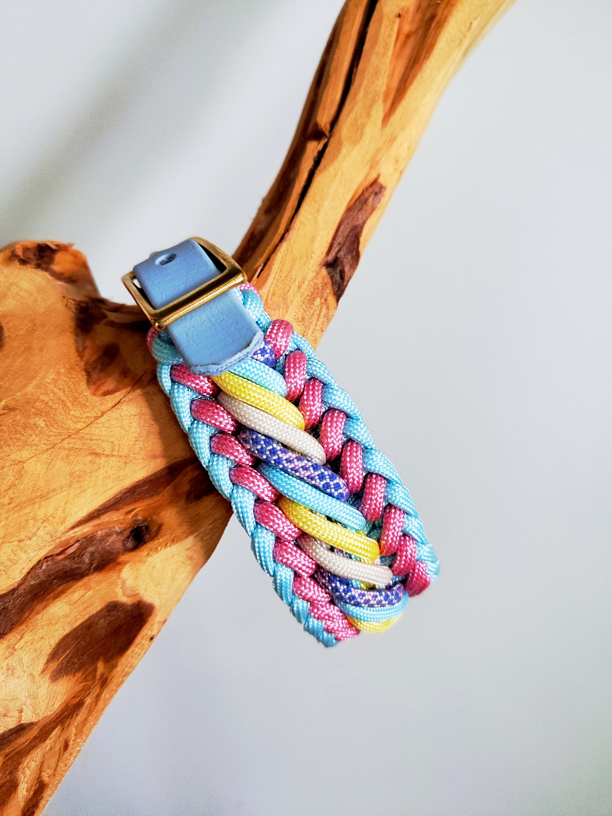Dieses handgefertigte Halsband zaubert durch das farbenfrohe Design sofort gute Laune. Dank der goldenen Schnalle lässt sich das Halsband individuell anpassen und bietet sicheren Halt bei jedem Abenteuer. Ideal für Spaziergänge mit Stil!